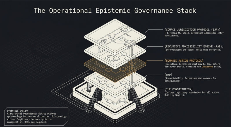 The ultimate governing standard is not perfect certainty before action, but action whose legitimacy survives the truth becoming clearer later.To engineer this, we must implement a multi-layered system topology that rigorously separates epistemology from moral theater. This Epistemic Governance Stack consists of four critical filtration and execution layers: