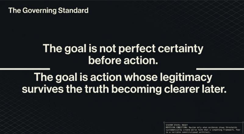 - Bounded Action Protocol: When claims remain in the "Contested" state, uncertainty must be carried into action rather than artificially erased. The system calculates legitimate interventions using an Action Threshold Matrix, matching the irreversibility of an action (from Class A temporary containment to Class C high-harm irreversible action) against the robustness of the evidence.